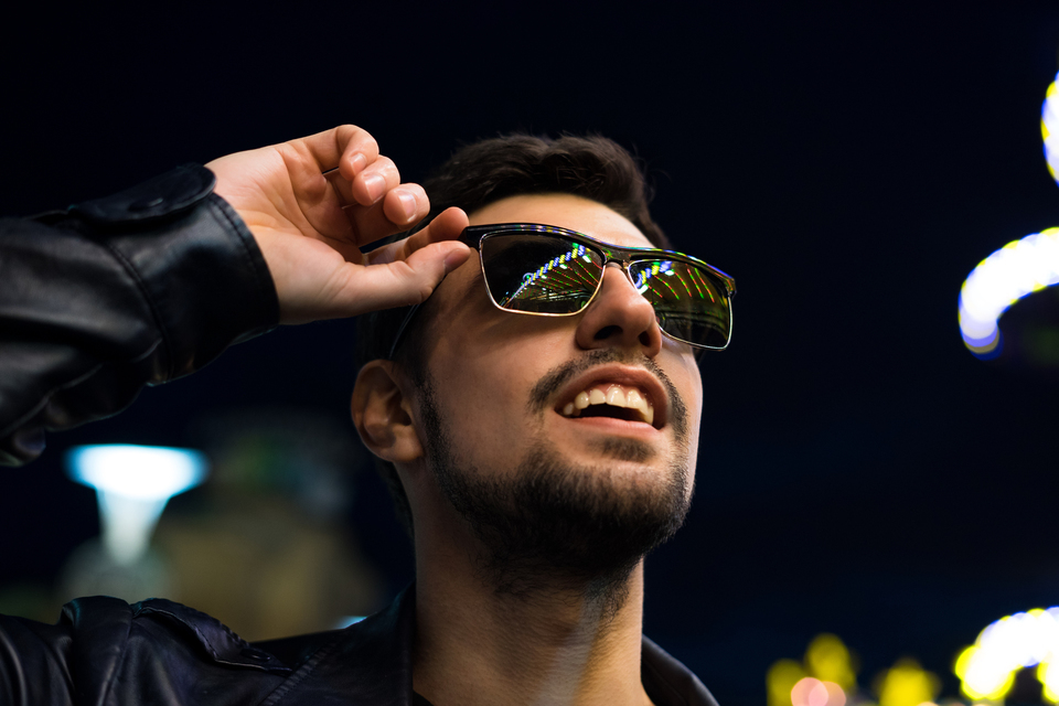 Smiling man in sunglasses with colorful reflection
